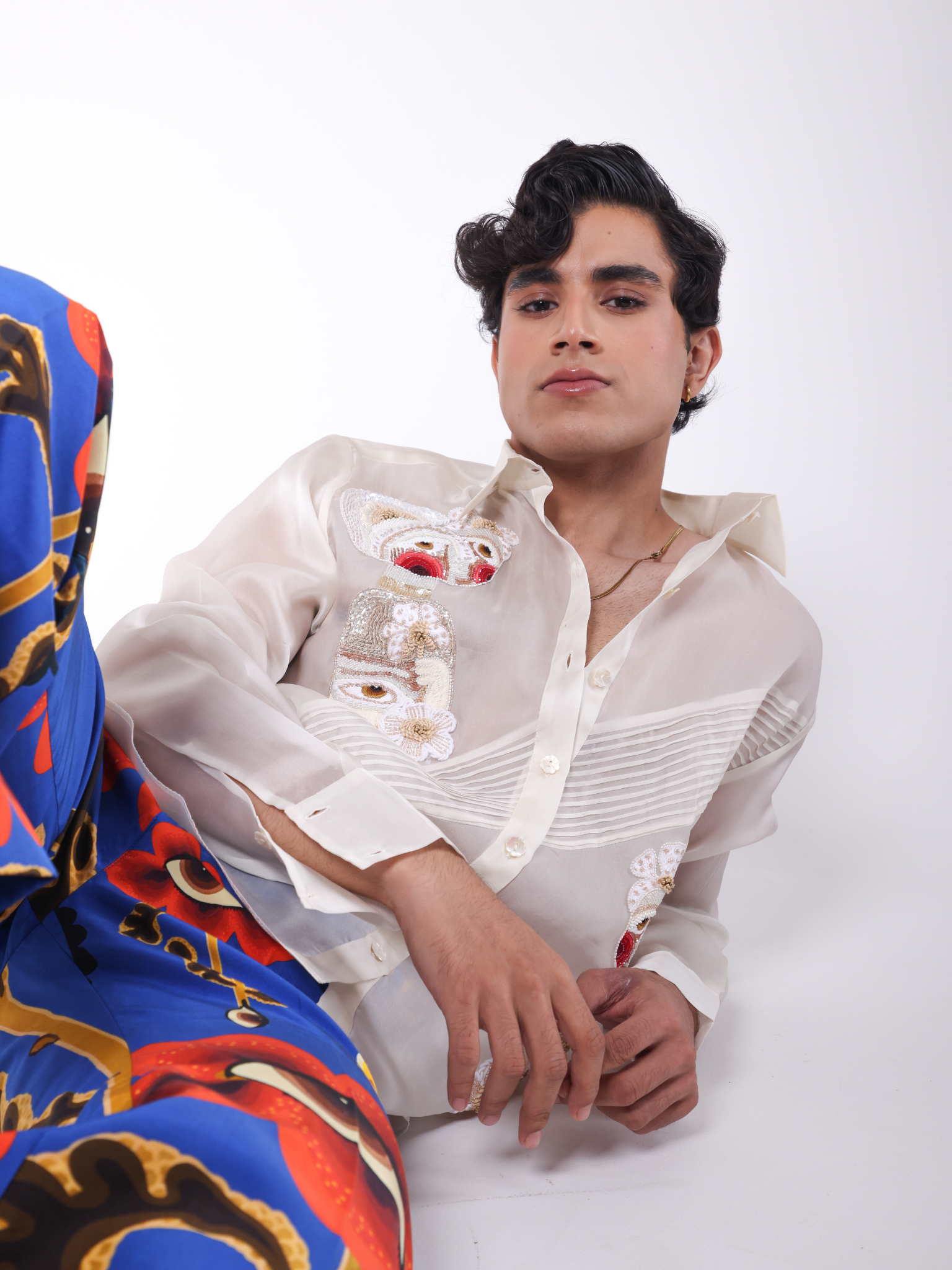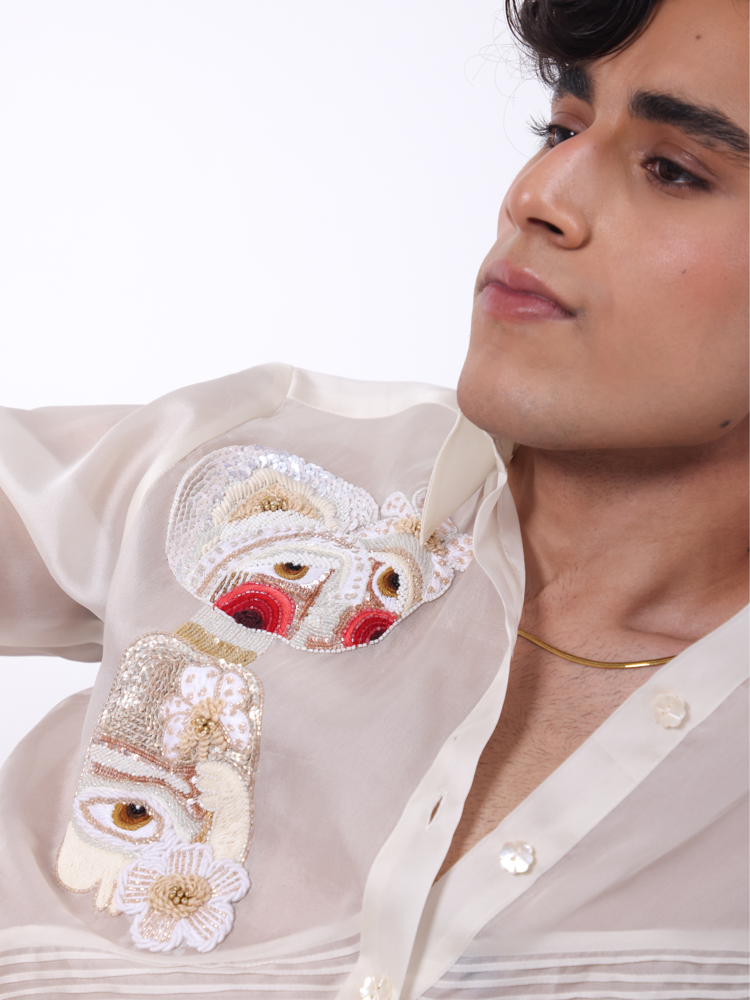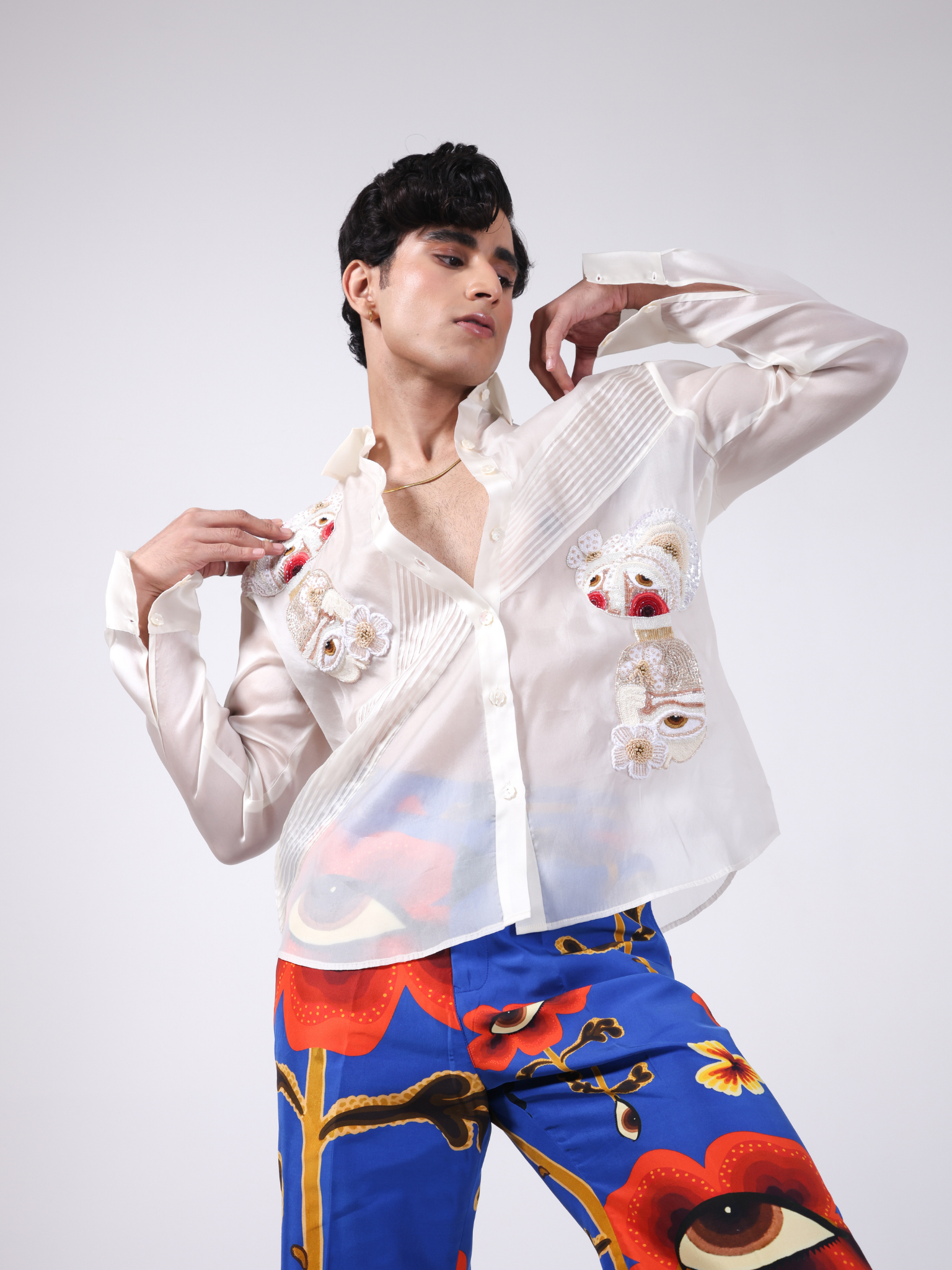 Pin tuck detailed organza shirt with 2 embroidered patch